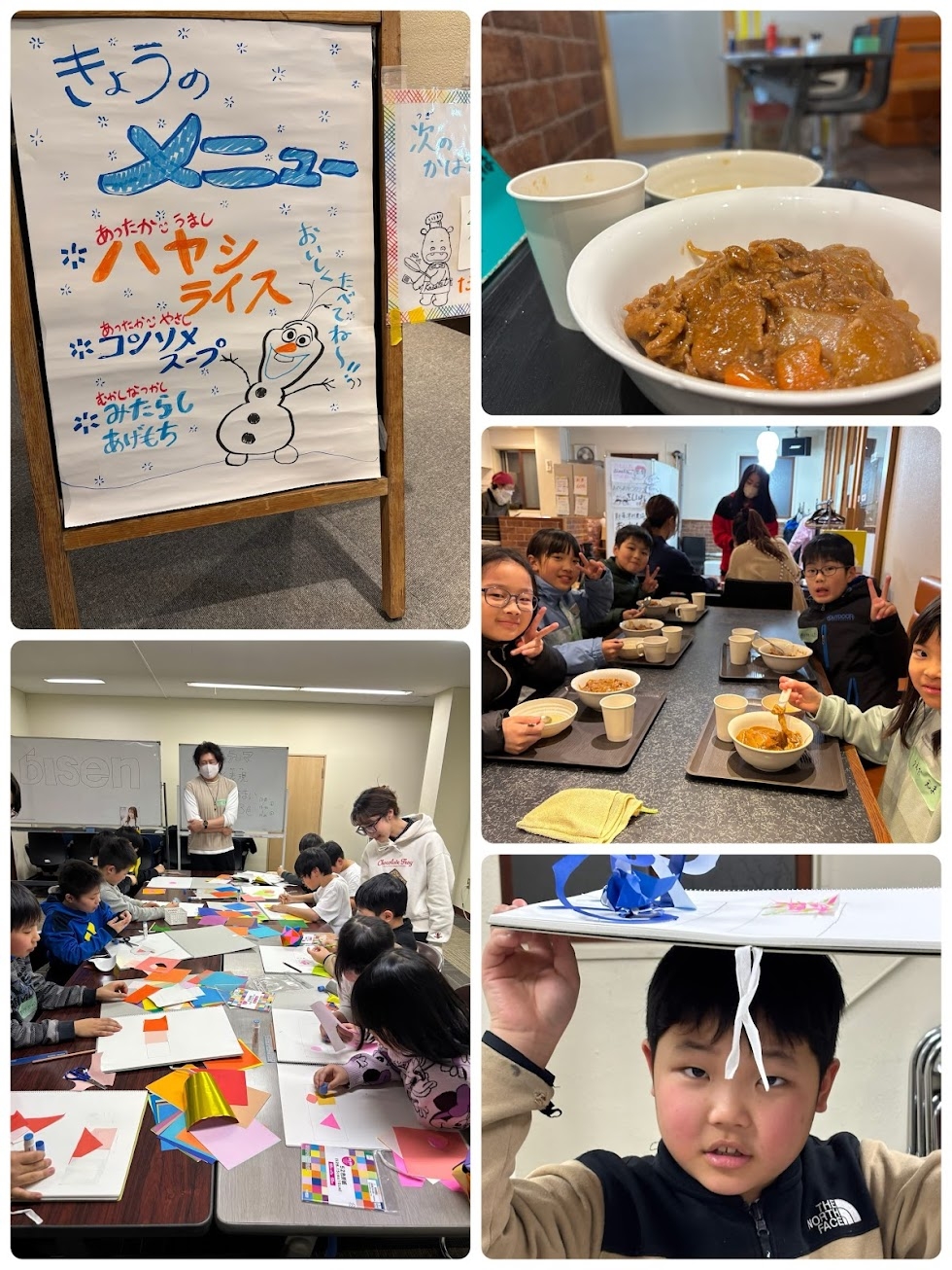 また、bisen(北海道芸術デザイン専門学校)の先生にアートのワークショップを開催していただきました。(7×21cm)の枠の中に折り紙を切って貼って ①【甘い】②【眠い】を表現します。